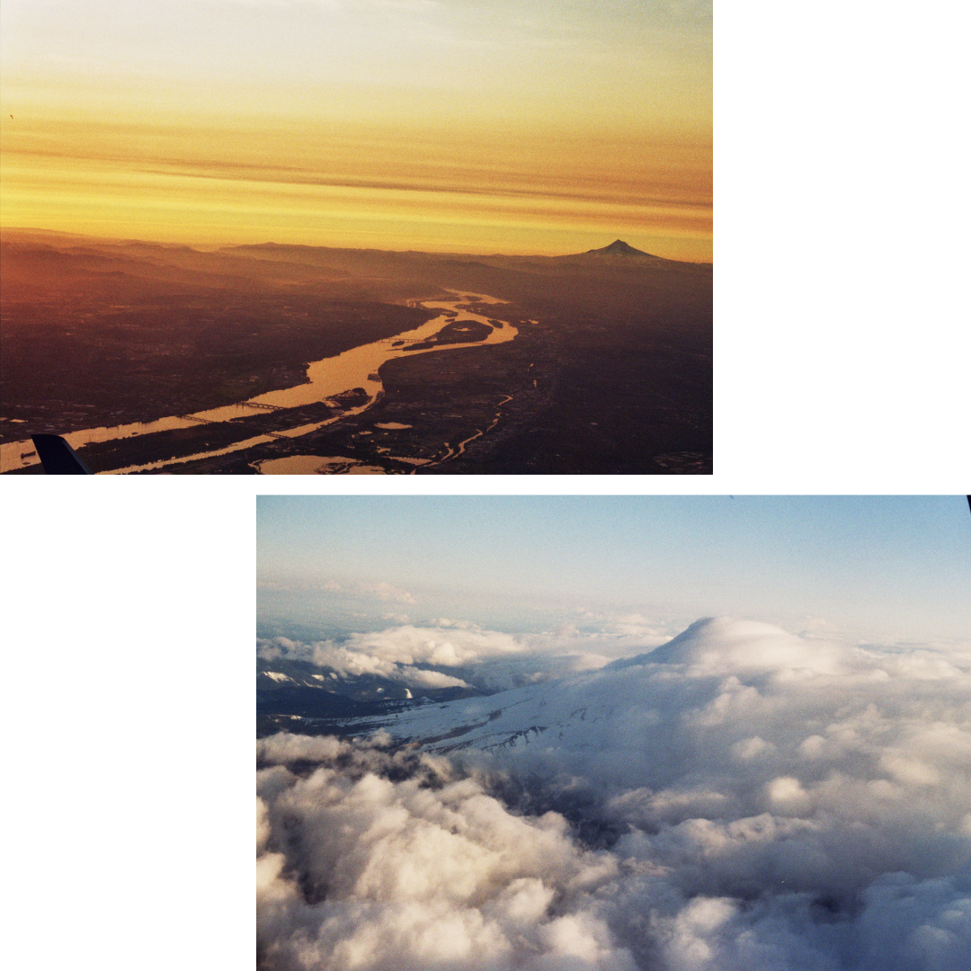 Both were taken on the same trip, but one while flying into Portland, the other flying out of Portland. The top one, bathed in the orange of the evening sun with the Columbia River stretching back to Mt. Hood, makes me feel warm. The other, again of Mt. Hood but in closeup, cloud-enrobed splendor, was taken in the afternoon, and I remember gasping when I first got the roll developed and saw this among the prints. It made quite a few rounds on tumblr back in the day, often without crediting me.